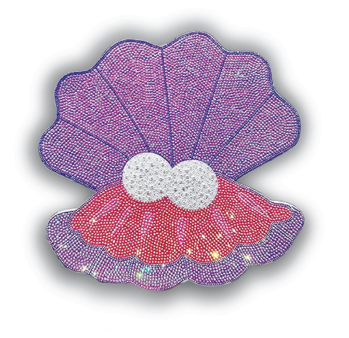 Rhinestone art on a wooden block in the shape of an oyster. Acrylic paint under rhinestones and pearls that were individually placed.